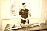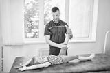 The physiotherapist rehabilitates the child in the gym