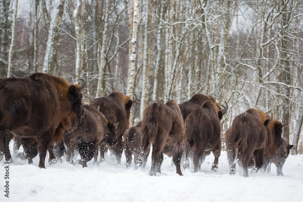 Large brown bisons Wisent running in winter forest with snow. Herd Of European Aurochs Bison, Bison Bonasus. Nature habitat. Selective focus