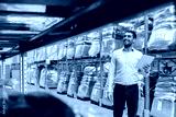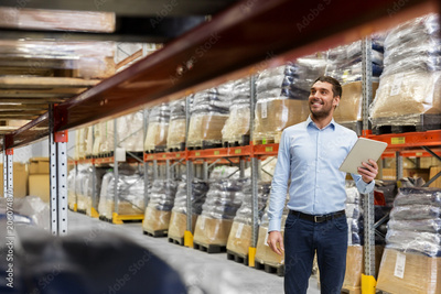 wholesale, logistic business, export and people concept - happy businessman with tablet pc computer checking goods at warehouse