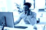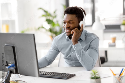 business, technology and people concept - happy african american businessman with headphones and computer computer listening to music at office