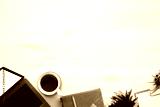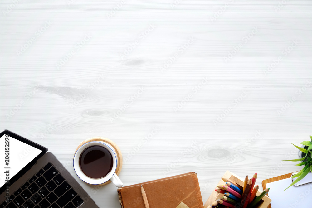 Office wooden desk laptop computer, office accessory and copy space.