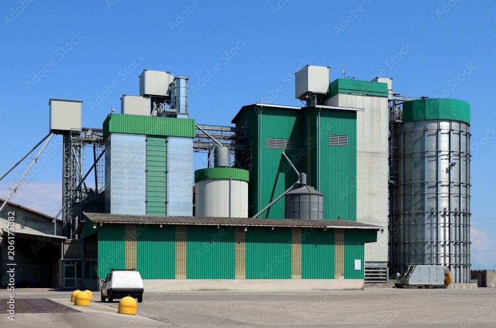 Green color agricultural building with grain silos and drying towers