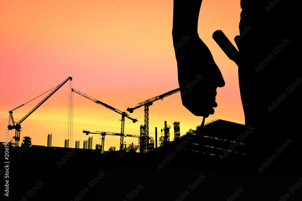Silhouette engineer with building construction background and sunset