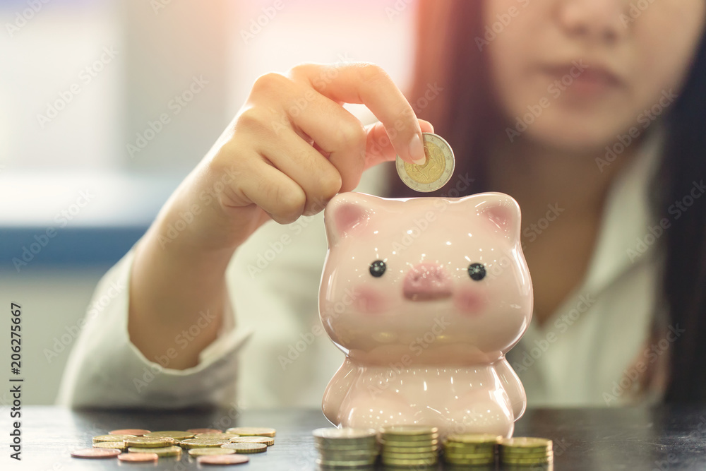 Close up hand female stack euro coins putting in piggy bank, Saving money concept