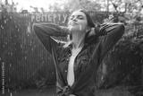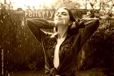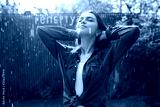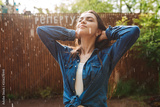 Portrait of young beautiful lady in denim shirt dreamily closing her eyes while standing under rain in park