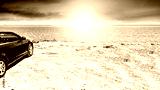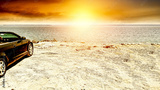 Sandy beach and blurred sea and yellow and orange sunset bokeh sky background. Copy space for products.