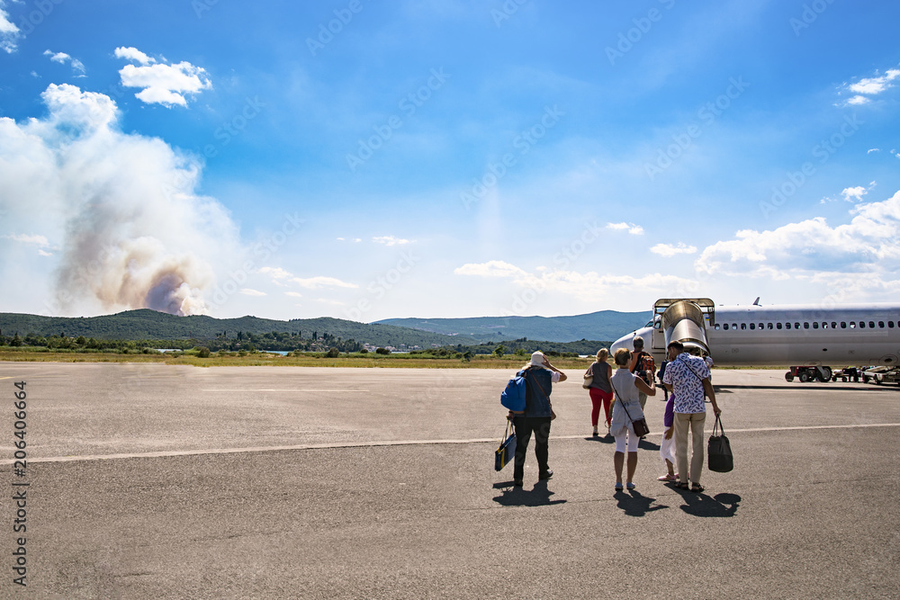 A cloud of thick smoke in the mountains. View from the airport. People hurry to board a plane