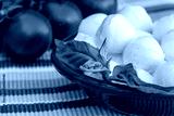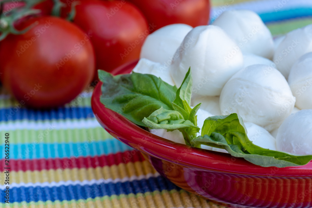 Close up of fresh mozzarella balls and basil with a vine of tomatoes on a colorful mat.