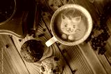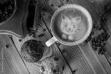 Cat foam face of latte art coffee in cup with scattered coffee beans and biscuits on old wooden table