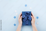 Childrens hands holding a gift or present box decorated confetti stars on blue table top view.