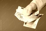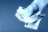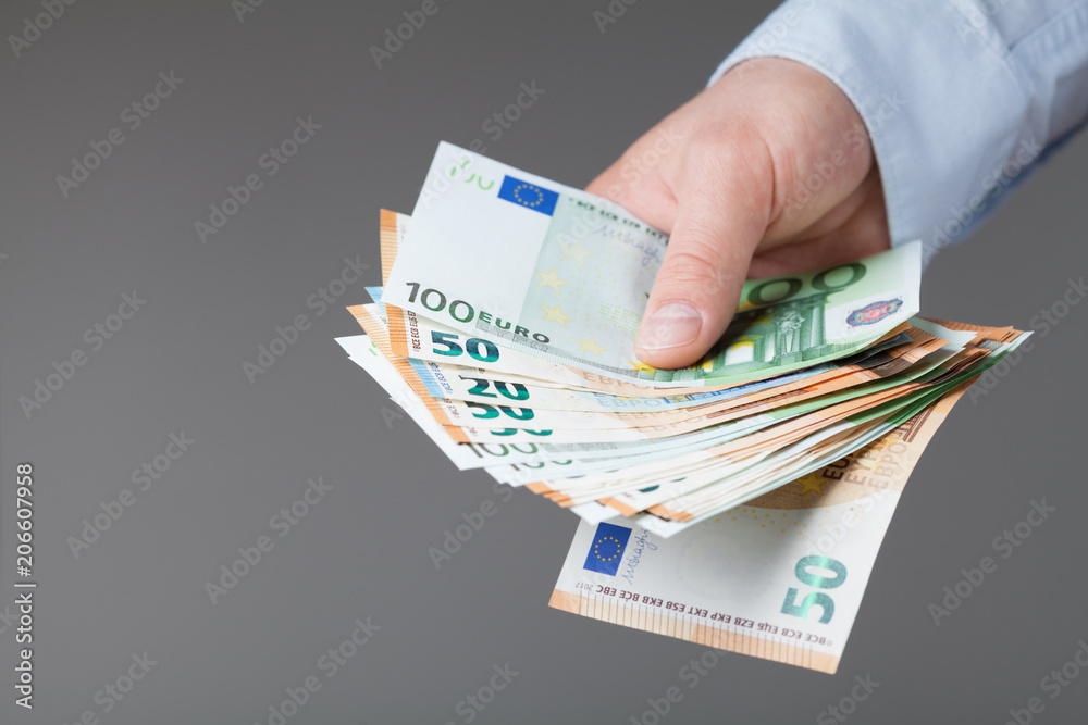Man in shirt holding euro money in his hands. Banking, salary and donate concept.
