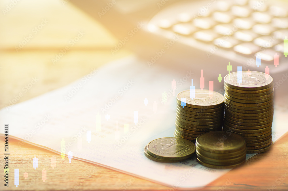 Finance, profit, capital banking and investment concept, Double exporsure stacked of coins and night city with graph