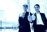 Compliment of teamwork, businesspeople show thumb to praise and great sign for parthner