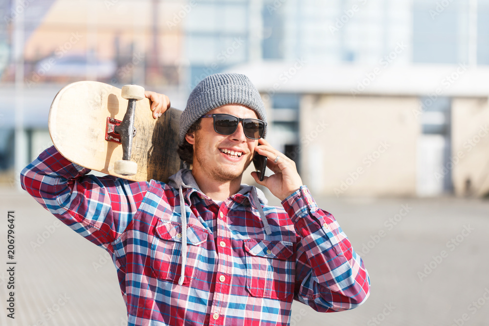 Portrait of hipster man with sunglasses dressed in cheked shirt and cap holding skateboard on shoulder and talking by smartphone before modern building