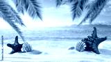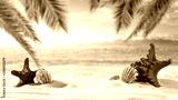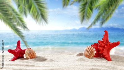 Tropical summer beach composition with sand and shells in the foreground and palm tree leaves in the upper frame. Blurred background of sea and blue sky.