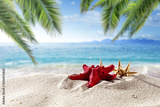 Close up of shell and starfish on sandy beach. Blue sea and blue sky background. Copy space for products. Palm leaves in the foreground.