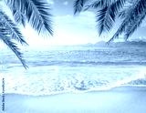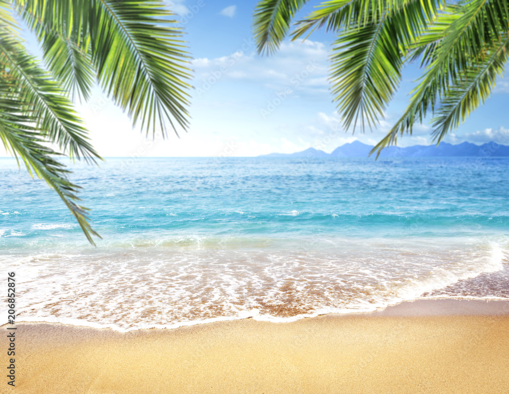 Sandy beach and blue sea and blue sky background. Copy space for products. Palm leaves in the foreground.