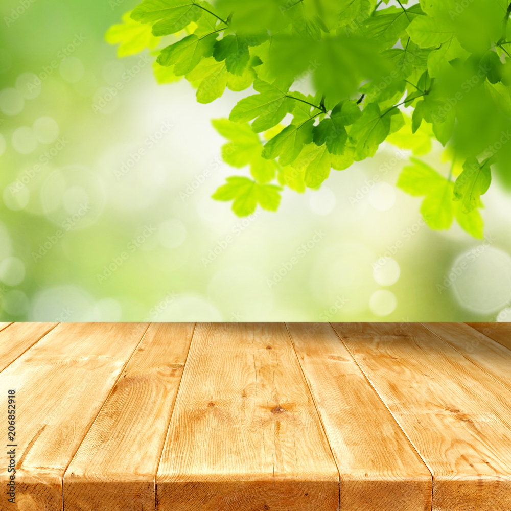 Wooden table with copy space for products and blurred green background and with tree leaves and branches at the top.