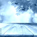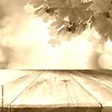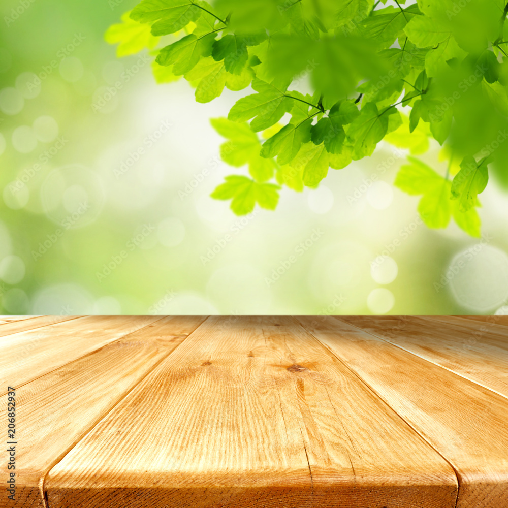 Wooden table top with copy space for products and blurred green background and with tree leaves and branches at the top.