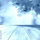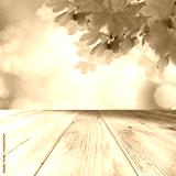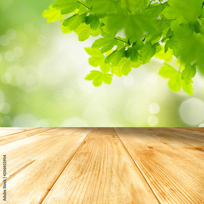 Wooden table top with copy space for products and blurred green background and with tree leaves and branches at the top.