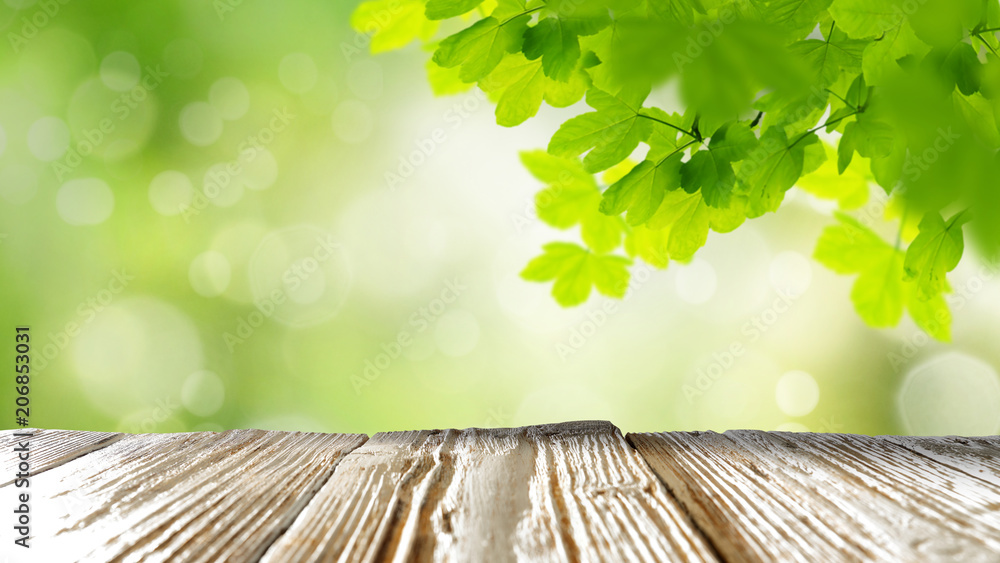Wooden white retro board table and green tree leaves background. Copy space for products.