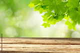 Spring template with empty wooden brown board table and green tree leaves background. Copy space for products.