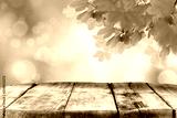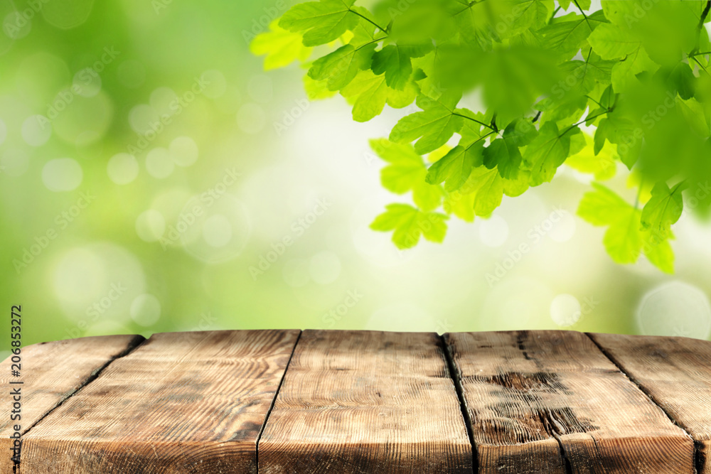 Spring template with empty wooden brown board table and green tree leaves background. Copy space for products.