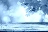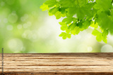 Spring template with empty wooden brown board table and green tree leaves background. Copy space for products.