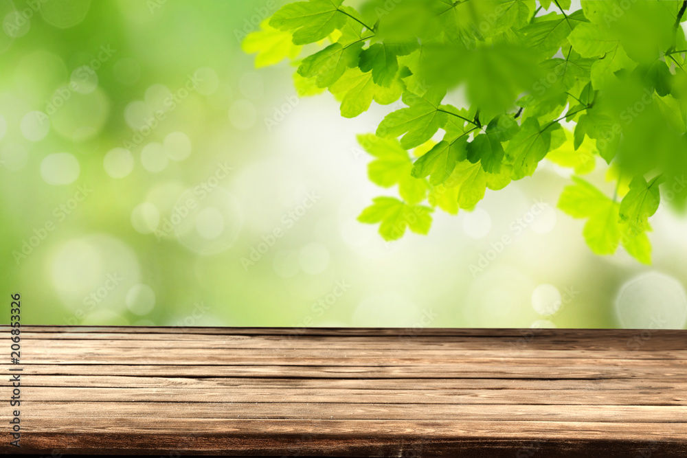 Spring template with empty wooden brown board table and green tree leaves background. Copy space for products.