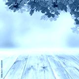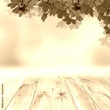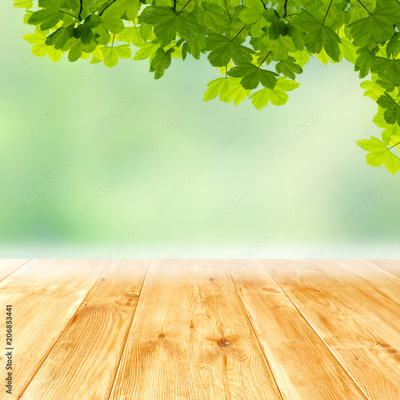 Spring template with empty wooden brown board table and green tree leaves background. Copy space for products.