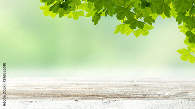 Wooden white chic board table and green tree leaves background. Copy space for products.