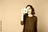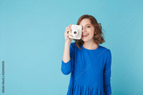 Portrait of young beautiful lady in dress standing with little white camera on over blue background. Pretty girl happily looking in camera