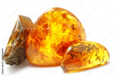 Three bright pieces of amber of different shapes and colors on a white background. Amber texture. A natural mineral for jewelry. Frozen resin with inclusions insects inside. Sun Stone