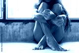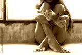 Asian woman feels hopeless and loneliness Beautiful woman is trafficking, kidnap or abduct by bad guy. Poor woman tie rope at arms, legs sit on bed near window. She feel depressed, imprison by someone