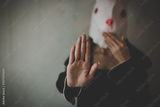 Charming beautiful woman wears rabbit mask and pajamas. Attractive girl show symbol of stop that pretty girl wants to tell someone don’t kill animals or stop doing violence against animal. Copy space