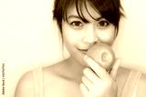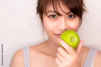 Portrait charming beautiful healthy woman: Attractive girl hold green apple. Pretty asian woman love to eat fruit, make her get good health, nice skin, lose weight and weight control. She get happy