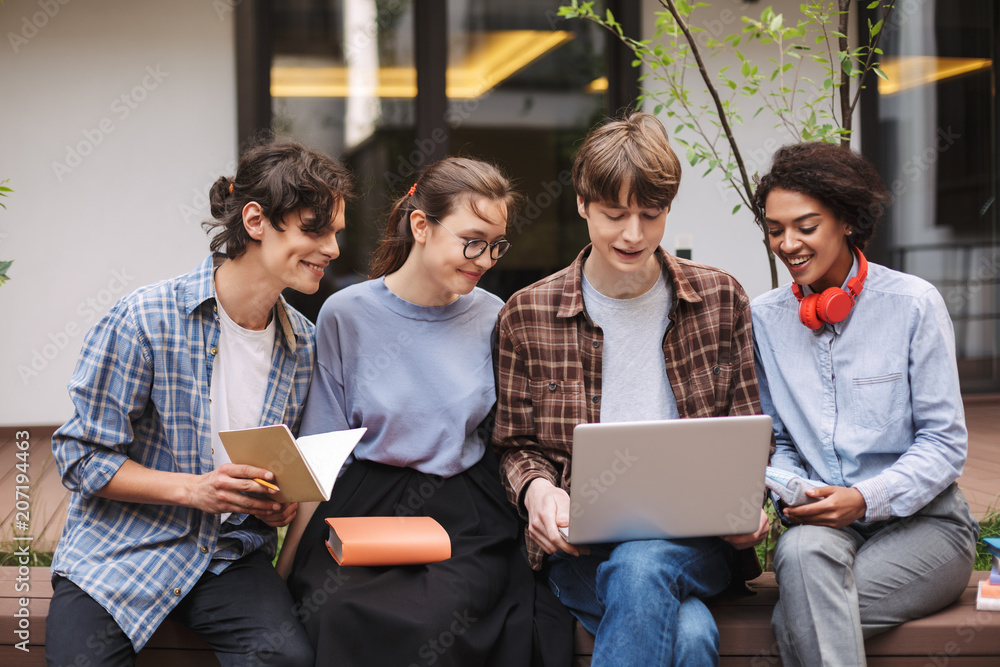 Group of smiling students sitting on bench with laptop and books in courtyard of university. Young students using laptop while study together outdoors