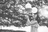 A beautiful woman has joyful and feels happiness. Pretty girl holds balloons and gorgeous beautiful woman retrospect in the past when she was child. Lovely girl is enjoying life with park background