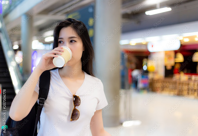 Charming beautiful woman hold paper cup of coffee and drink back coffee in the morning that make attractive girl feel fresh and happy before pretty girl go to work or travel to destination. copy space