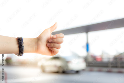 Thumb up is the symbol or sign of help or favor or hitchhike from hitchhiker on a road. Beautiful woman hope some driver will stop car and pick her up. Pretty girl is showing her thumb for hitchhiking