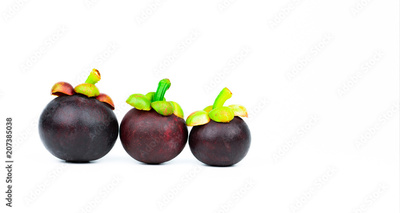 Whole mangosteen showing purple skin isolated on white background with space. Tropical fruit from Thailand. The queen of fruits. Asia fresh fruit market concept. Natural source of tannin and xanthones