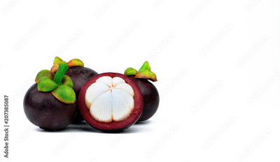Three whole purple mangosteen and another cross section isolated on white background. Tropical fruit from Thailand. The queen of fruits. Asia fresh fruit market. Natural source of tannin and xanthones