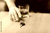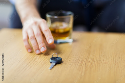 alcohol abuse, drunk driving and people concept - close up of male driver hand with whiskey glass taking car key from table