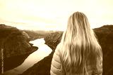 Blonde hair woman alone in sunset mountains adventure lifestyle vacations weekend getaway aerial Norway lake landscape