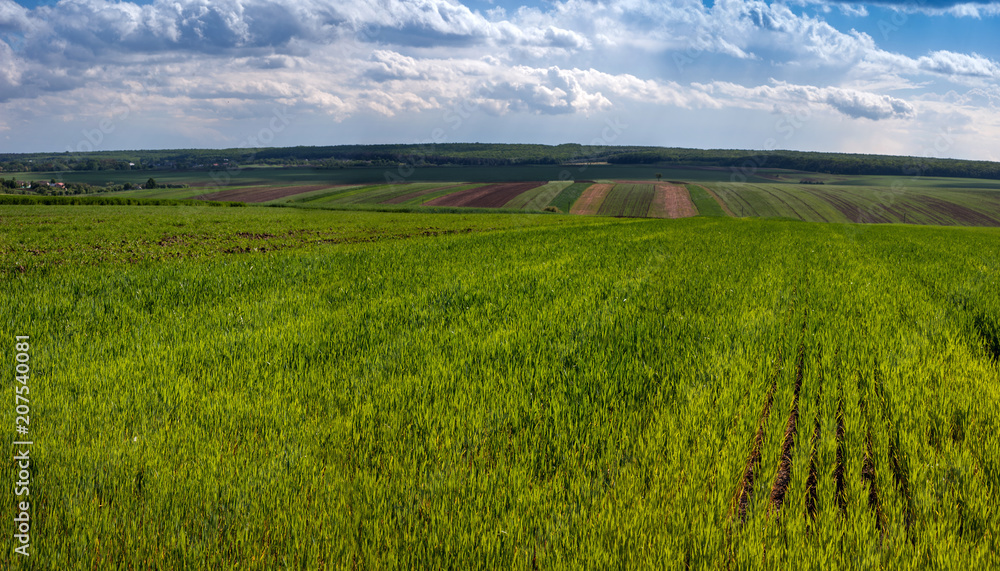landscape with agricultural crops of wheat a nd cloiudly sky