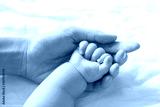 Mother uses her hand to hold her baby's tiny hand to make him feeling her love, warm, comfort and secure.