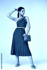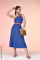 Pretty beautiful sexy elegance woman skin tan body fashion model glamor pose wear blue dress casual clothes for party summer collection makeup hair style brunette success accessory bag jewelry studio.