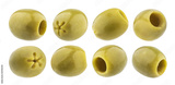 Pitted olives collection. Green olive isolated on white background with clipping path