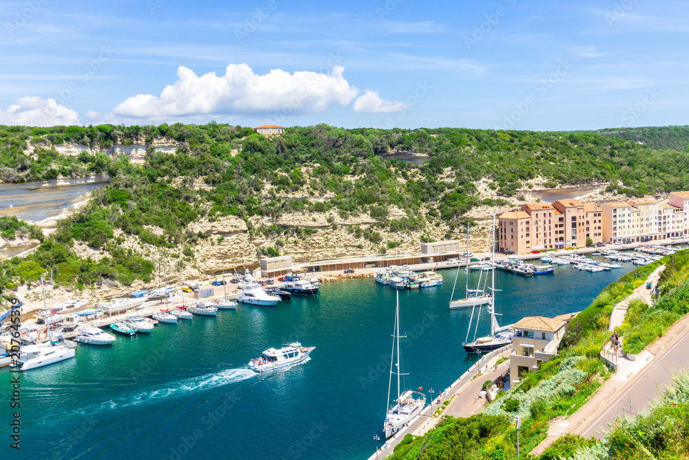 Landscape on Corsica island, beautiful view of Calvi town with castle on hill in summertime, France