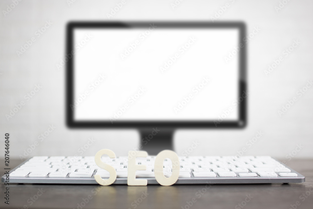 Search Engine Optimization concept, wood of SEO on keyboard in front of computer